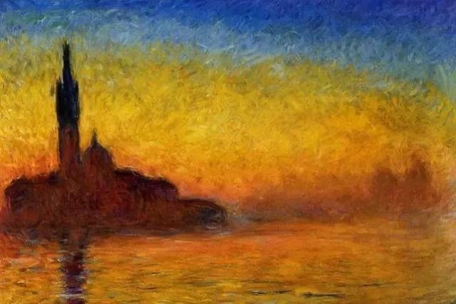这是莫奈于1873年在阿弗尔港口画的一幅写生,他在同一地点还画了一张脍炙人口的名画《日出·印象》。这两幅画在1874年3月25日开幕的印象派画家第一次联合展览会上展出,由于两幅画都没有标题,一名新闻记者讽刺莫奈的画是"对美与真实的否定, 只能给人一种印象"。于是"印象主义"就这样诞生了。1891年5月5日,印象派画家毕沙罗给儿子吕西安的信中,对这幅画是这样评价的:" 在迪朗画廊举行的莫奈画展开幕。我一只眼睛上了绷带,所以只能用独眼欣赏莫奈精彩的《日落》。他的画在我看来非常光彩夺目,堪称是大师的作品。但是,由于我们自身的训练,我们应该看得更深刻一些;所以我问自己,这些作品还缺乏什么。要找出缺陷很困难;准确与和谐都不成问题。我能提出些什么意见的,大概就是画面的统一,或者是某些地方怎么画的技术问题。色彩与其说是很强烈,还不如说很美。画得很细腻,有浮动感,尤其是作品的背景。不管怎样,这是一个伟大的艺术家!当然这是一次巨大的成功,他的作品实在是太诱人了,展出获得成功乃是意料中的事。这些画透露出心满意足。"