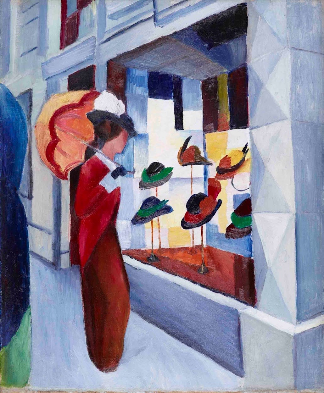 1914年夏天,奥古斯特·麦克(August Macke)和家人在瑞士图恩湖畔的希尔特芬根度过了短暂的几个月。老城街道上的商店和周围的景观不断出现在艺术家的作品中。这其中包括帽子店,像其他服装店一样,丰富的色彩和样式受到画家的青睐,同时麦基也从中获得启发,创作了一系列橱窗绘画。他十分重视这个系列作品。罗伯特·德劳内(Robert Delaunay)的窗画,其复杂的光影和镜面绘画,无疑是奥古斯特·马克(August Macke)的灵感来源。然而,他选择了一种较为平静、看似静止的构图。画面中展出的五颜六色的帽子能与那位打着阳伞的女士雕像般的姿势相相得益彰。帽店的正面,与橱窗的墙壁的描绘方式相同,是严格结构化的几何平面。