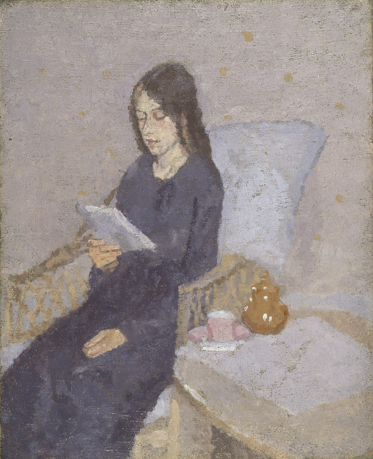 格温多琳·玛丽·约翰是一位威尔士艺术家,她的大部分职业生涯都在法国度过。她的作品多是通过使用一系列相近色调呈现的无名女性肖像画。尽管她在世时生活在哥哥奥古斯都·约翰和情人奥古斯特·罗丹的名气下,但她的名声却在去世后稳步增长。今天我们展示的是一幅亲密的印象派画作,画的是一位身材苗条、不知名的年轻女性,她有着一头乌黑长发,坐在一把扶手椅上读着一封信,她的左边有一张小桌子。这幅画展示了微妙的颜色关系,在这幅作品中,紫色有着不同的深浅,如淡紫色和浅紫色。格温·约翰通常喜欢创作小尺寸的作品,用以增强作品的亲切感。