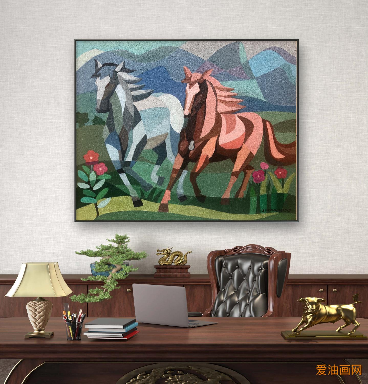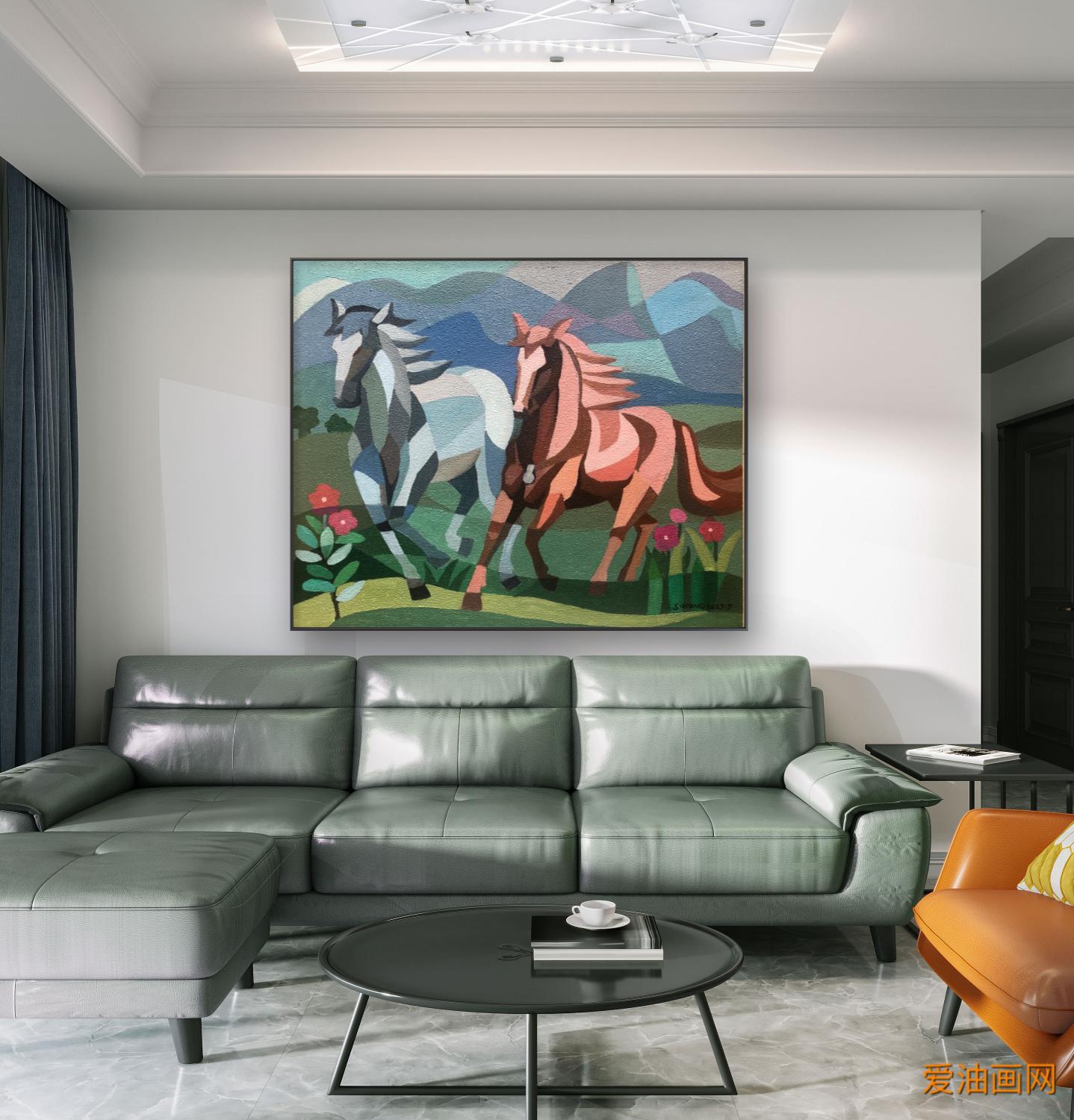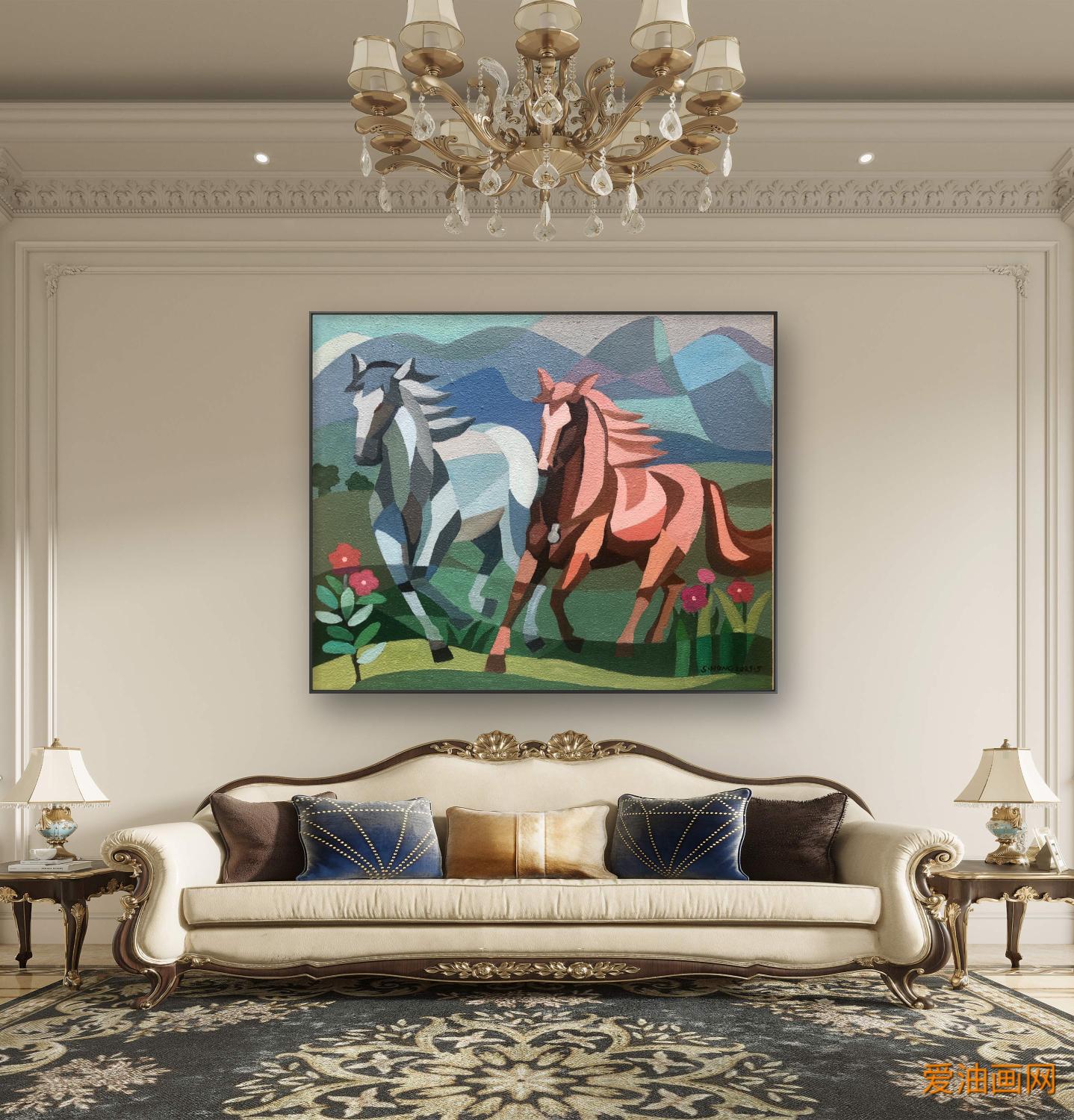 双马奔腾,寓意福禄双全,一马当先,马到成功,也比喻友好伴侣同心协力,勇往直前之意。色彩明快简洁,冷暖对比,和谐统一,简约装裱,现代时尚,原创作品,版权归爱油画网所有。已经售出,可定制。