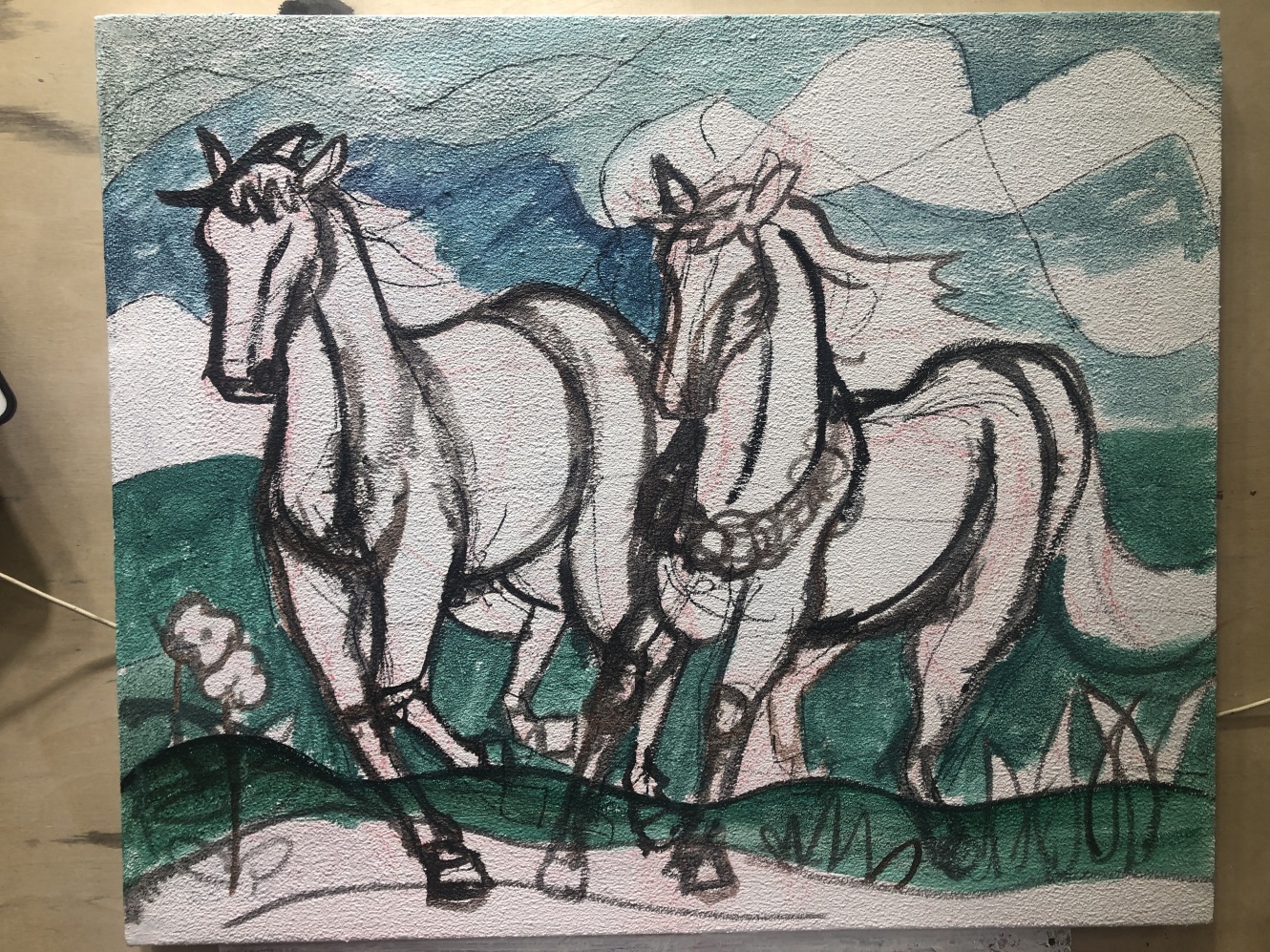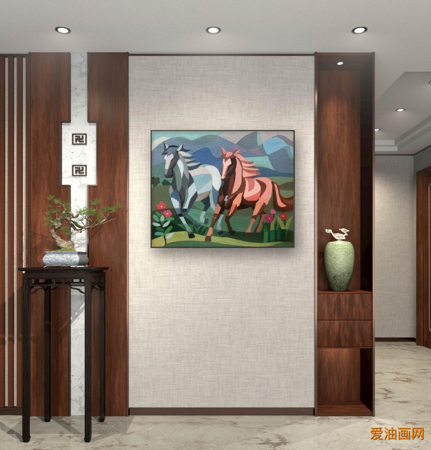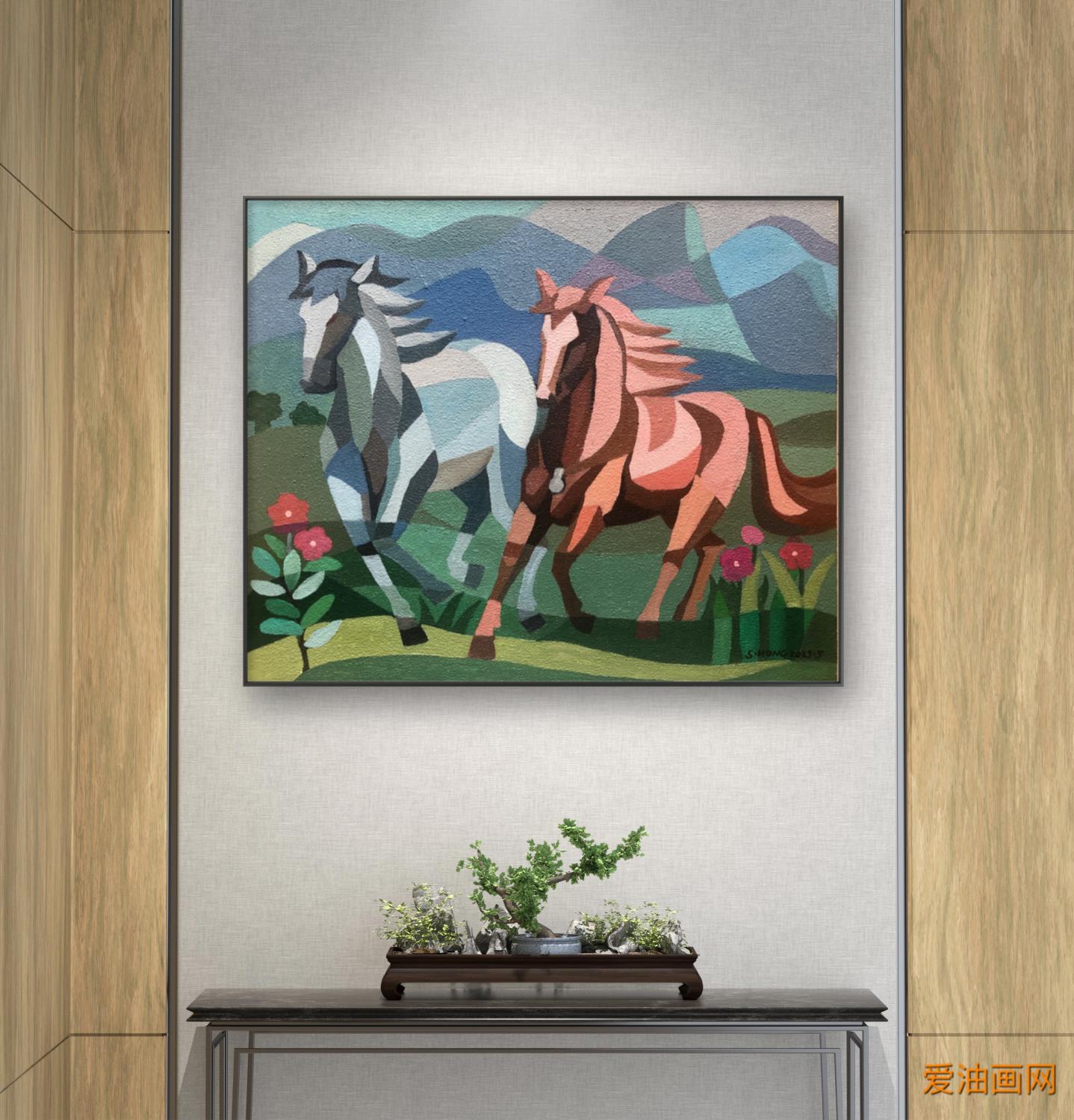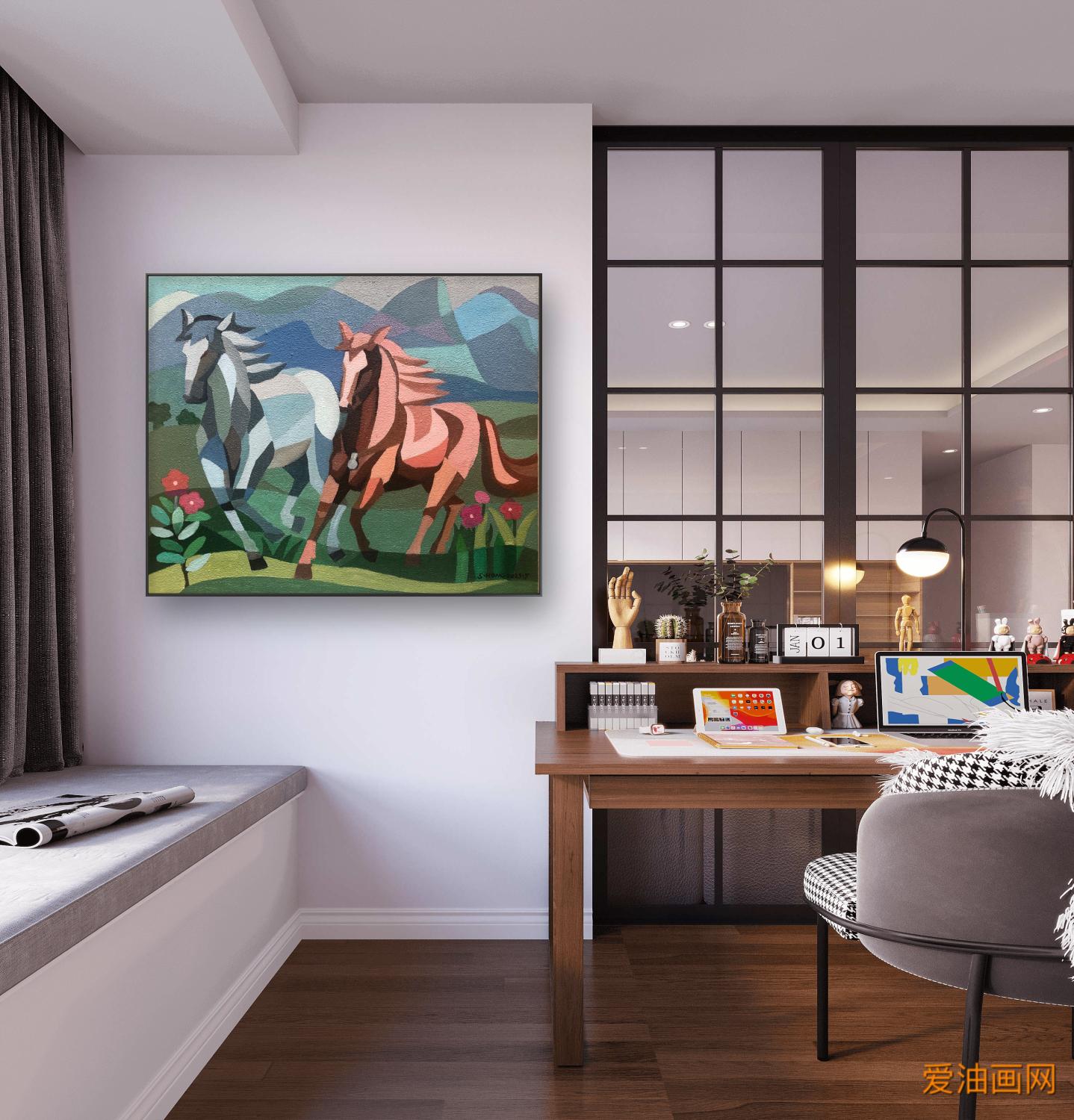 双马奔腾,寓意福禄双全,一马当先,马到成功,也比喻友好伴侣同心协力,勇往直前之意。色彩明快简洁,冷暖对比,和谐统一,简约装裱,现代时尚,原创作品,版权归爱油画网所有。已经售出,可定制。
